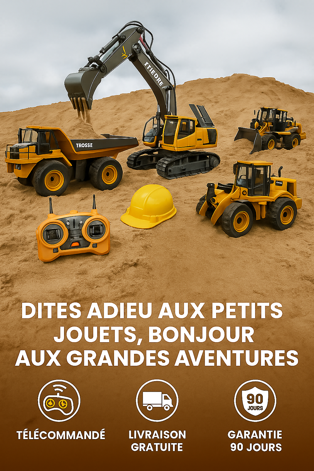 ✔️ Comprend : 1× bulldozer RC, 1× excavatrice RC, 1× tombereau RC, 1× chargeuse RC